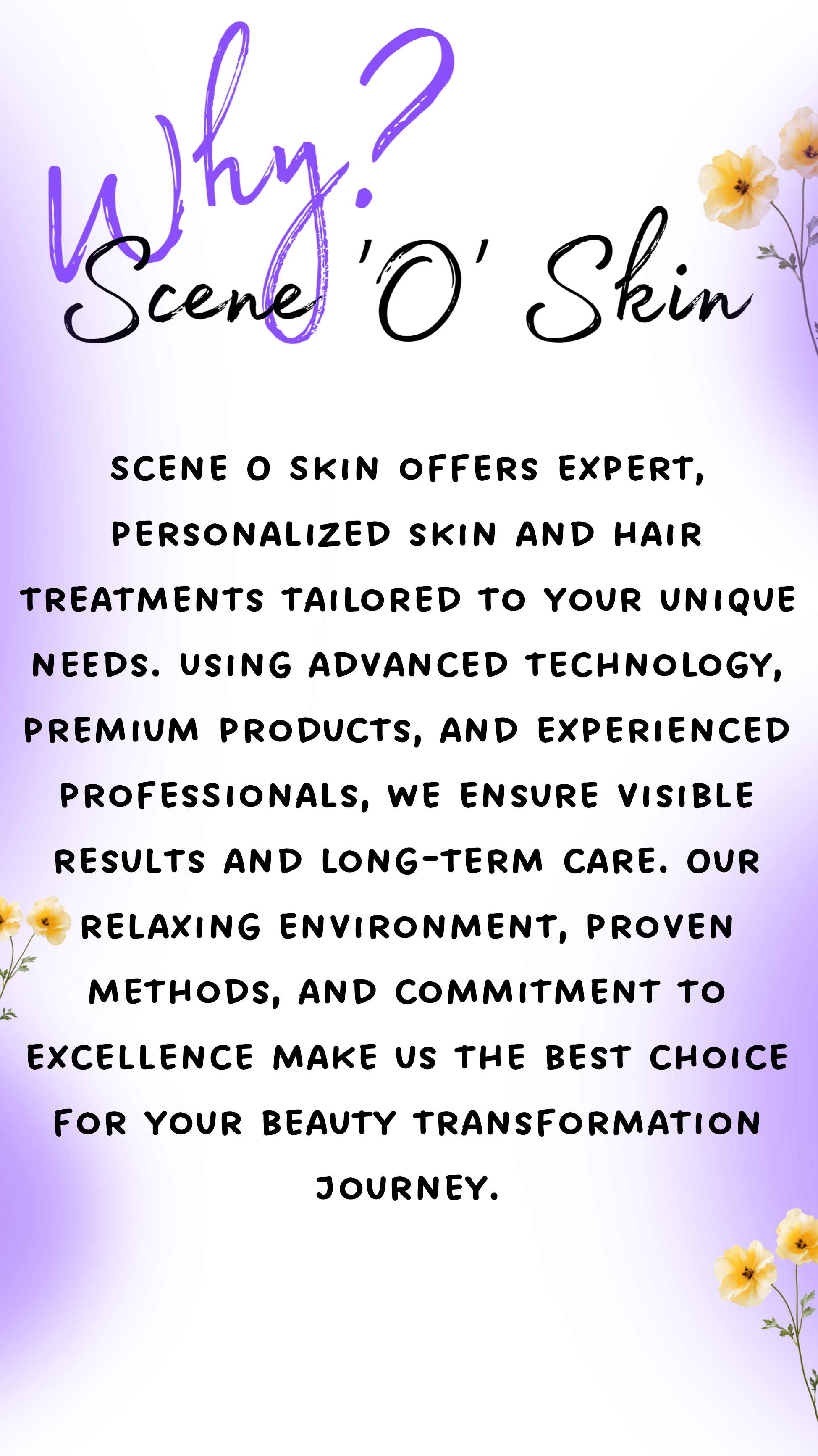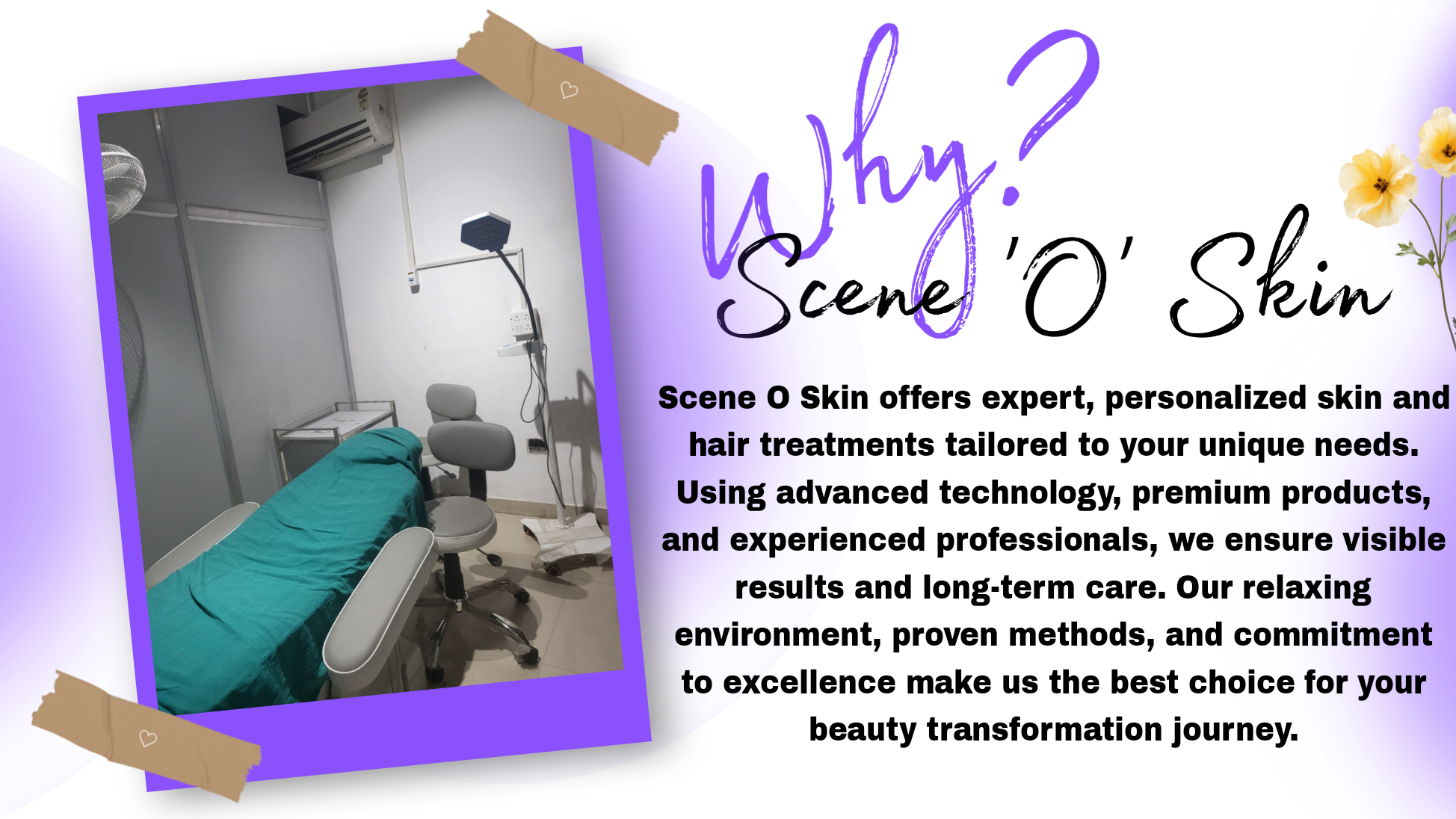Welcome to Scene O Skin, your trusted clinic for advanced skin and hair treatments. We specialize in personalized care for concerns like acne, pigmentation, aging, and hair loss. Our expert team uses the latest technology and premium products to deliver safe, effective, and long-lasting results. Whether you're seeking rejuvenation or restoration, we’re here to help you achieve radiant skin and healthy hair. At Scene O Skin, beauty meets science—because you deserve to look and feel your best, naturally and confidently.